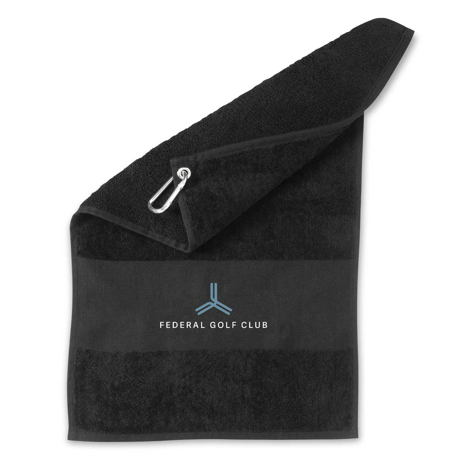 This 400gsm 100% cotton golf towel has a smooth strip for branding your logo or message, and a silver clip for attaching it to your golf bag.